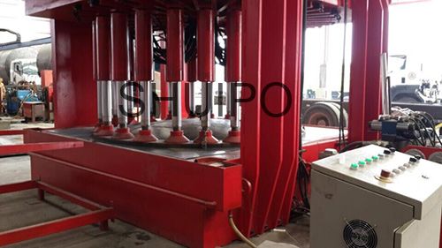液壓缸采用倒吊的方式安裝在上平臺(tái)上,上平臺(tái)安裝導(dǎo)向條,液壓缸可在導(dǎo)向條內(nèi)自由移動(dòng),以適應(yīng)各種封頭的形狀。液壓系統(tǒng)應(yīng)用比較廣泛,其壓力大、可操作性好,配件比較容易采購(gòu)。
